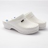 Ženska klompa izrađena od ekološke kože sa ventilirajućim rupicama i kožnom tabanicom koja sadrži masažni gel. Đon je naparvljen od poliuretanske mase..