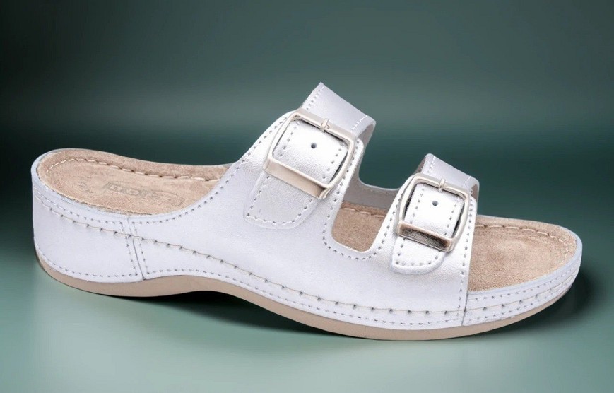 Anatomski oblikovano gazište pruža prirodnu potporu stopalu i doprinosi pravilnom hodu, smanjujući pritisak na pete i zglobove. Dva podesiva kaiša sa metalnim kopčama omogućavaju precizno prilagođavanje širini stopala, čime se postiže stabilnost i udobnost tokom celodnevnog nošenja.